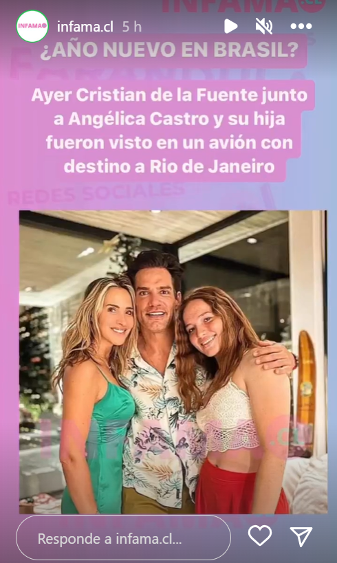 “Ayer Cristián de la Fuente junto a Angélica Castro y su hija fueron vistos en un avión con destino a Río de Janeiro”, manifestó el citado medio.