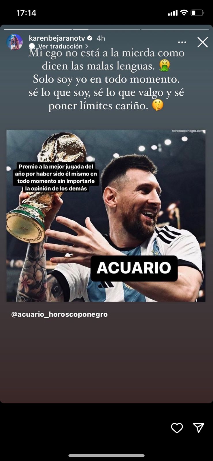 Mediante su cuenta de Instagram, la exchica Mekano compartió una publicación del horóscopo del signo Acuario junto a una fotografía de Lionel Messi sosteniendo la copa.