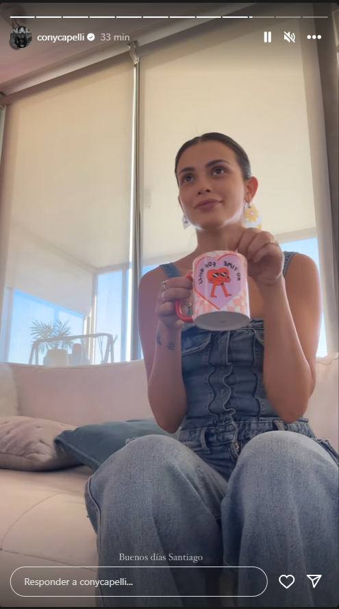 El primer registro la muestra sentada en un sillón mientras revuelve una infusión caliente, mientras de fondo, se escucha la cobertura del matinal de Chilevisión al caso del presunto fraude al fisco de la exalcaldesa.