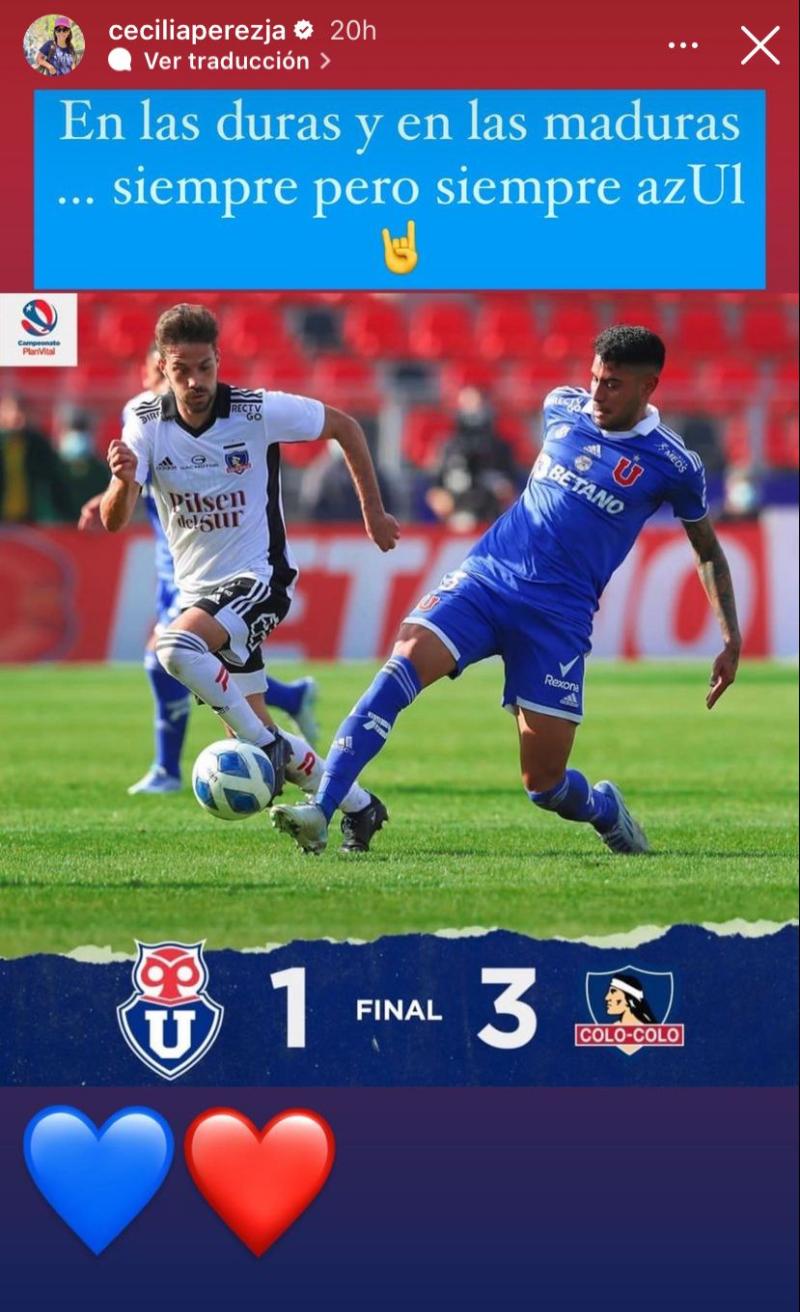 Pero debido a la pérdida de este partido, la Vicepresidenta de "Universidad de Chile", Cecilia Pérez, compartió un emocionante mensaje de aliento para los fanáticos del "Azul, Azul", en su cuenta de Instagram, donde expresó su lealtad para el equipo de fútbol, pase lo que pase.