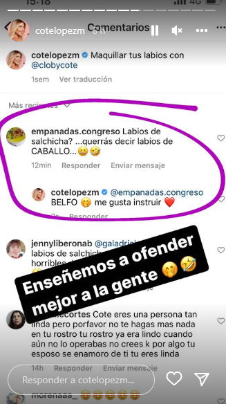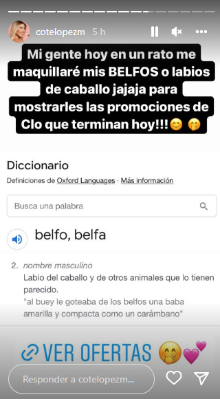 Finalmente, "Coté López" compartió un término que buscó en un diccionario on-line, que cumple lo dicho por el usuario "Empanadas Congreso", escribiendo: "Mi gente, hoy en un rato me maquillaré mis BELFOS o labios de caballo, jajaja. Para mostrarles las promociones de Clo que terminan hoy".