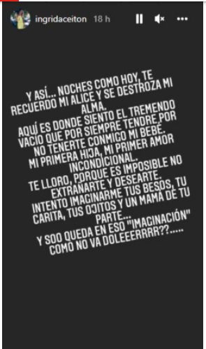 El mensaje, que caló hondo entre sus miles de seguidores, no se detuvo allí, y “Te lloro, porque es imposible no extrañarte y desearte. Intento imaginarme tus besos, tu carita, tus ojitos, y un ‘mamá’ de tu parte… Y solo queda en eso: imaginación. ¿Cómo no va a doler?”, concluyó Ingrid.
