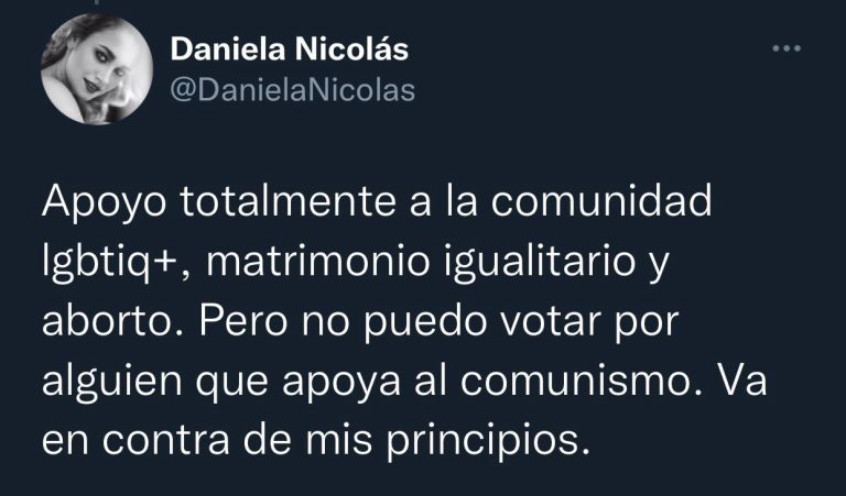 “Apoyo totalmente a la comunidad LGBTIQ+, matrimonio igualitario y aborto. Pero no puedo votar por alguien que apoya el comunismo. Va en contra de mis principios”, fue lo que indicó la modelo en su cuenta de Twitter, dejando en evidencia que no le entregará el voto al candidato Gabriel Boric.