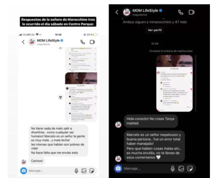 La cuenta de Instagram @realityculiao, mostró una conversación de la argentina con una seguidora que le mandó el video de Marocchino durante la fiesta. “No tiene nada de malo salir a divertirse como cualquier ser humano. Marcelo es un señor, la gente es muy mala y mala leche. Las mismas que hablan son pobres de vida. No hace falta que me envíes esto”, comenzó replicando la modelo.