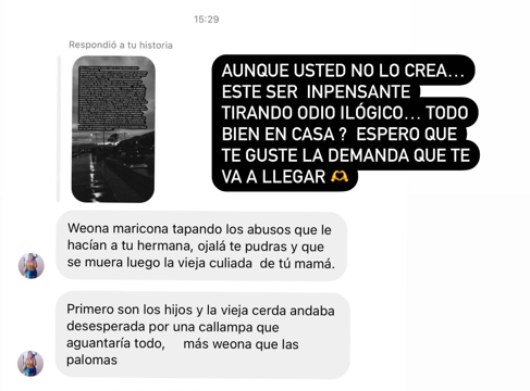 Pero no fue el único, ya que otras personas le continuaron escribiendo: “Weo… maricona, tapando los abusos que le hacían a tu hermana. Ojalá te pudras y que se muera luego la vieja cu… de tu mamá”.