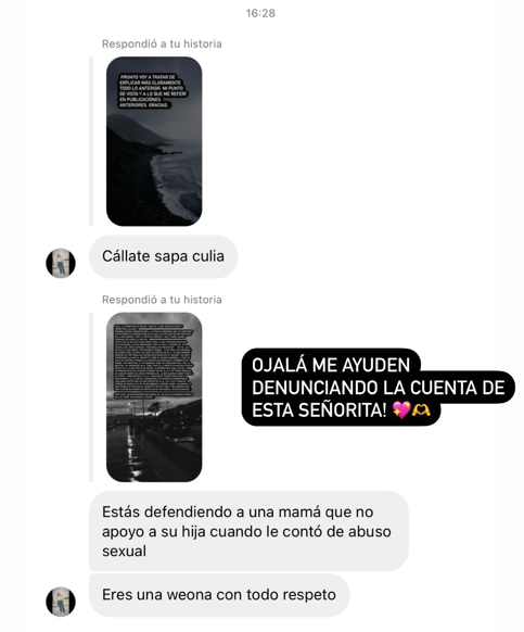 “Estas defendiendo a una mamá que no apoyó a su hija cuando le contó de su abuso sexual. Eres una weo… con todo respeto”, fueron algunos de los comentarios que recibió y que publicó en sus historias, solicitando a sus seguidores que le ayuden a denunciar.