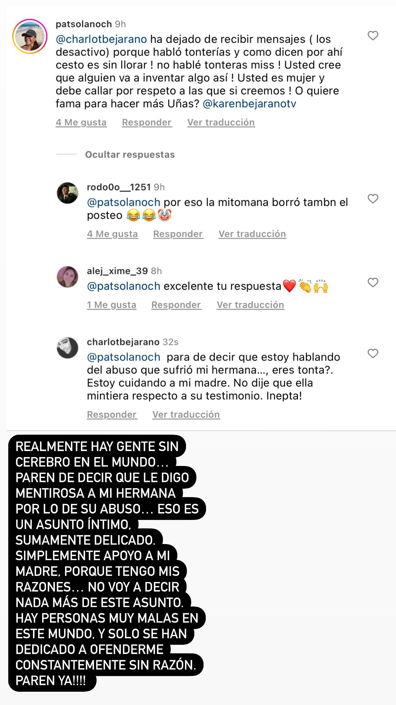 En esta ocasión, Charlot Bejarano quiso hacer públicos los mensajes de odio que ha recibido en su cuenta de Instagram tras este conflicto familiar.