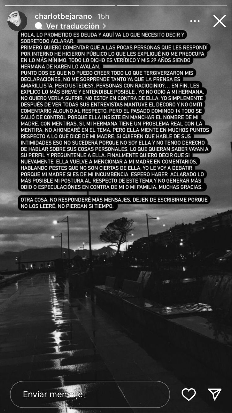 La polémica continúa entre las hermanas Bejarano, sobre todo luego de las cuestionadas declaraciones que lanzó Charlot, hermana de Karen, quien salió en defensa de su madre tras el mensaje de la ex chica Mekano por el Día de las Madres.