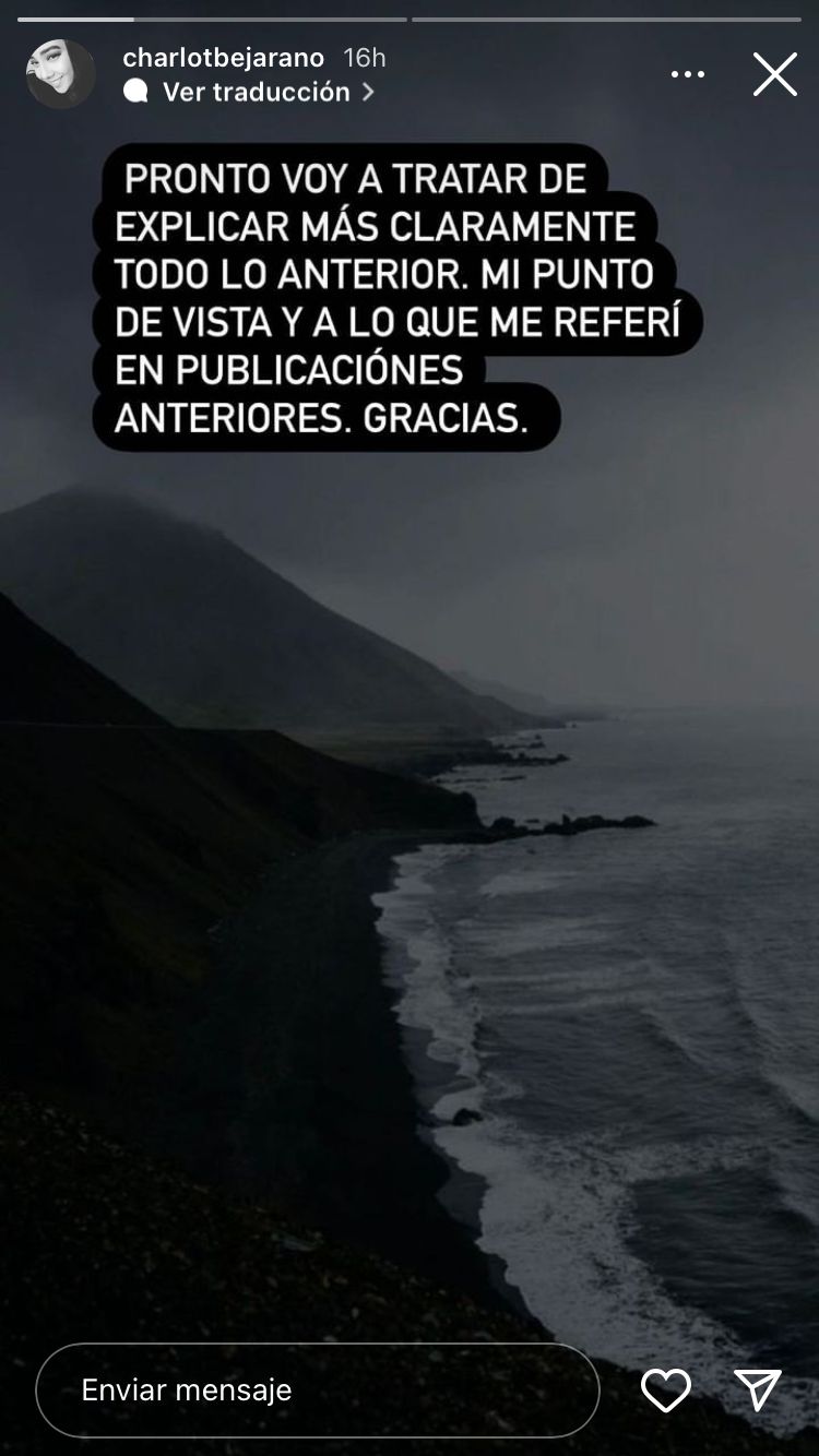 Tras esto, por medio de su cuenta de Instagram, Charlot insistió respecto a la tergiversación de sus palabras. “Hola, primero quiero comentar que a las pocas personas que les respondí por interno e hicieron público lo que les expliqué, no me preocupa en lo más mínimo”, aclaró.