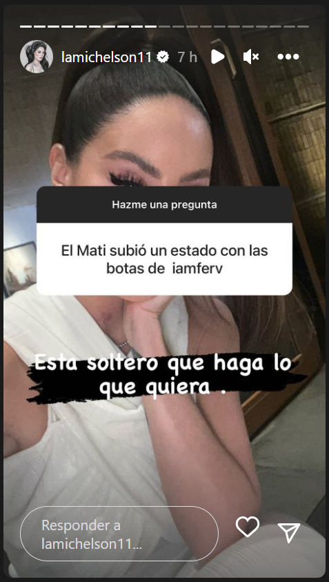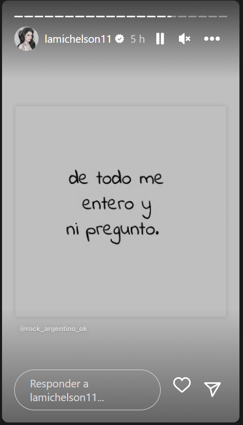 Ante esto, Ignacia Michelson se limitó a contestar: “Está soltero, que haga lo que quiera”, para más tarde subir un particular storie que decía “De todo me entero y ni pregunto”.