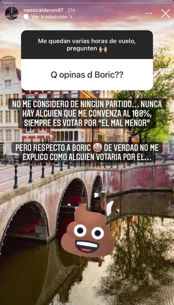 En su cuenta de Instagram realizó la dinámica de preguntas y respuestas en sus historias, en este contexto, le preguntaron por su favorito para ocupar un puesto en La Moneda. Calderón comenzó refiriéndose a Gabriel Boric y expresó: "No me considero de ningún partido. Nunca hay alguien que me convenza al 100%. Siempre es votar por ‘el mal menor'".