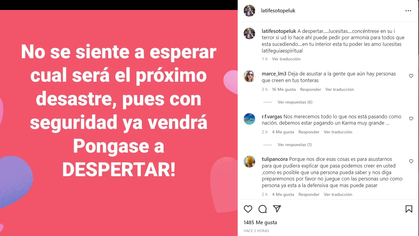 “Deja de asustar a la gente que aún hay personas que creen en tus tonteras”, “Es una lástima que recibamos sólo presagios negativos y nada positivo”, “Gracias por tan potente mensaje en el momento para indicado”, “Qué mensaje más nefasto... mal redactado y alarmista”, fueron algunos de los mensajes que recibió Latife Soto.