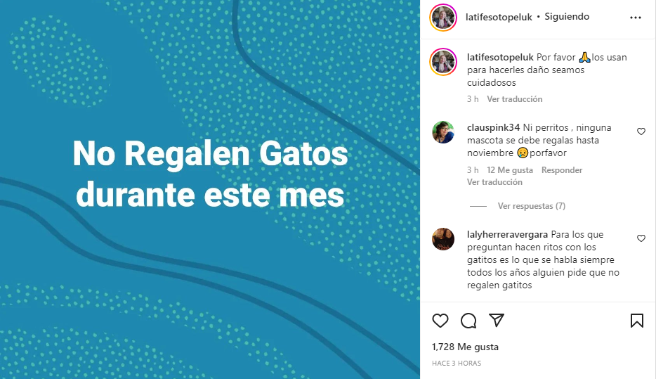 Tras la publicación que ya alcanza los 1.700 "likes", varias personas comentaron que “hacen ritos con los gatitos”. Una de las usuarias aclaró que “ni perritos, ninguna mascota se debe regalar hasta noviembre”.