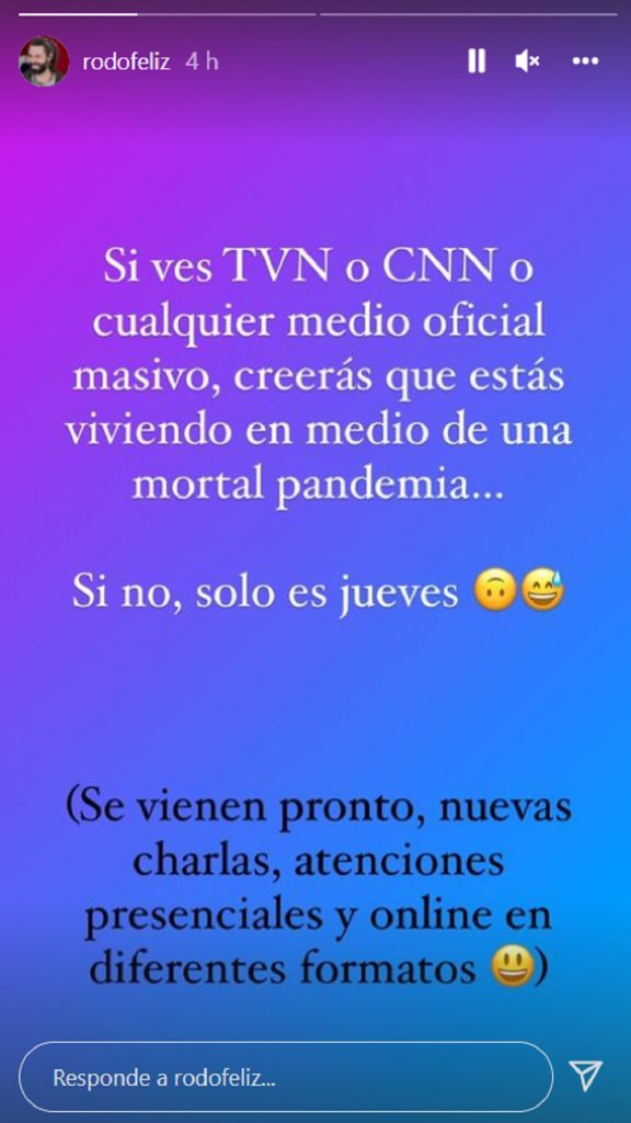 “Si ves TVN o CNN o cualquier medio oficial masivo, creerás que estás viviendo en medio de una mortal pandemia… Si no, solo es jueves”, escribió en su mensaje, el que acompañó con emojis de risa.