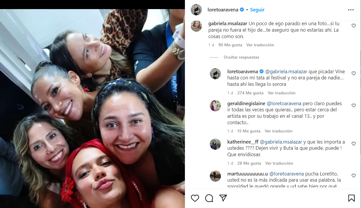 Ante este último mensaje, Loreto Aravena decidió responder sin filtro: “Que picada! Vine hasta con mi tata al festival y no era pareja de nadie…”.