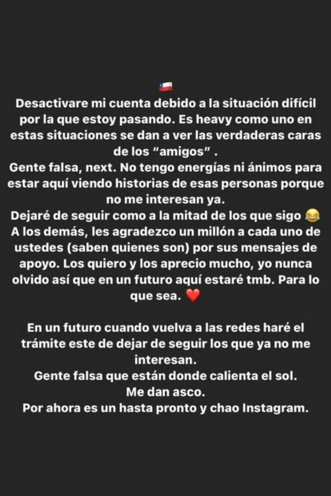"Desactivaré mi cuenta debido a la situación difícil por la que estoy pasando. Es heavy como uno en estas situaciones se dan a ver las verdaderas caras de los ‘amigos’. Gente falsa, next", comenzó detallando en una historia de Instagram.