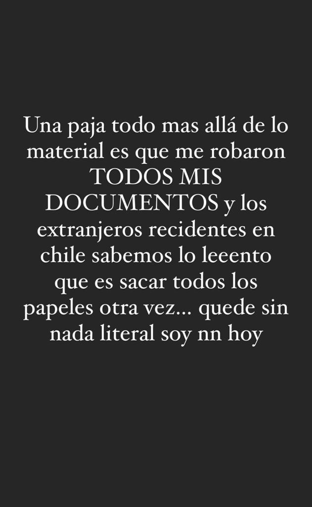 Prieto entregó más detalles de lo ocurrido: “Una paja todo más allá de lo material es que me robaron TODOS MIS DOCUMENTOS y los extranjeros residentes (sic) en Chile sabemos lo lento que es sacar todos los papeles otra vez…Quedé sin nada, literal. Soy nn hoy".