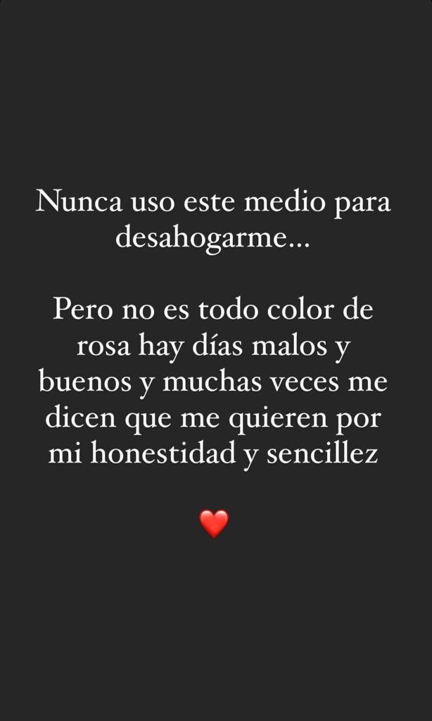 Finalizó su mensaje con: “Nunca uso este medio para desahogarme…Pero no es todo color de rosa, hay días malos y buenos y muchas veces me dicen que me quieren por mi honestidad y sencillez”.