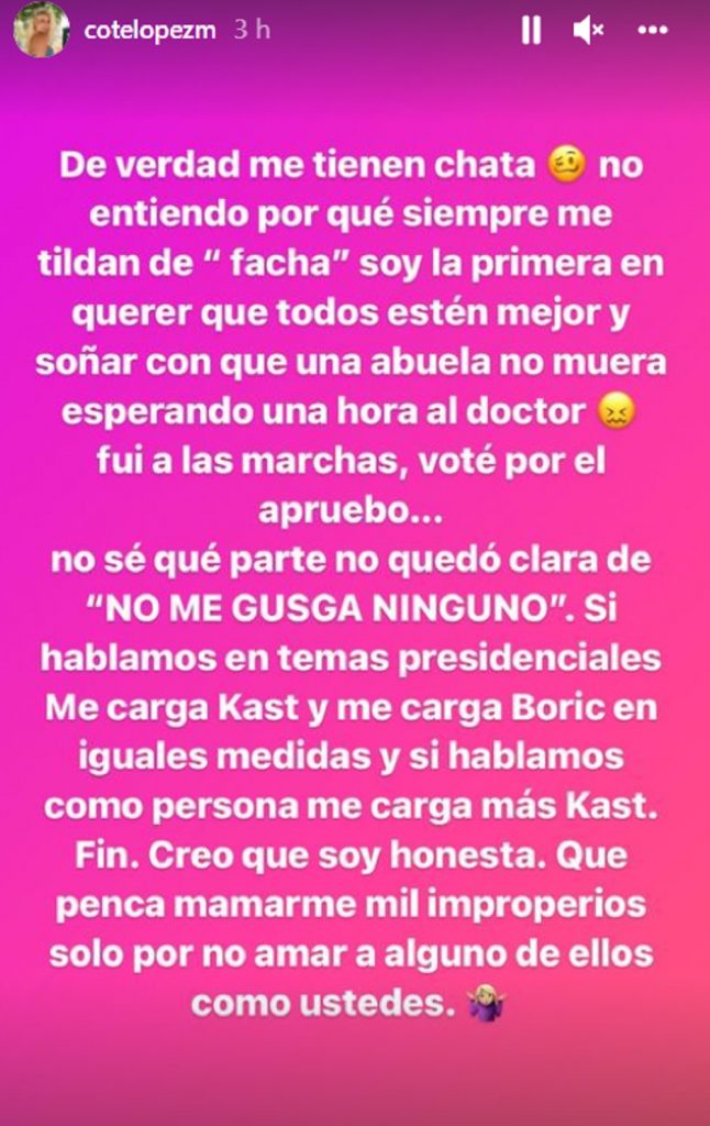 “De verdad me tienen chata. No entiendo por qué siempre me tildan de facha. no sé qué parte quedó clara de ‘no me gusta ninguno’. Si hablamos en temas presidenciales me carga Kast, me carga Boric en iguales medidas. Y si hablamos como persona me carga más Kast”, fue parte de lo que plasmó.