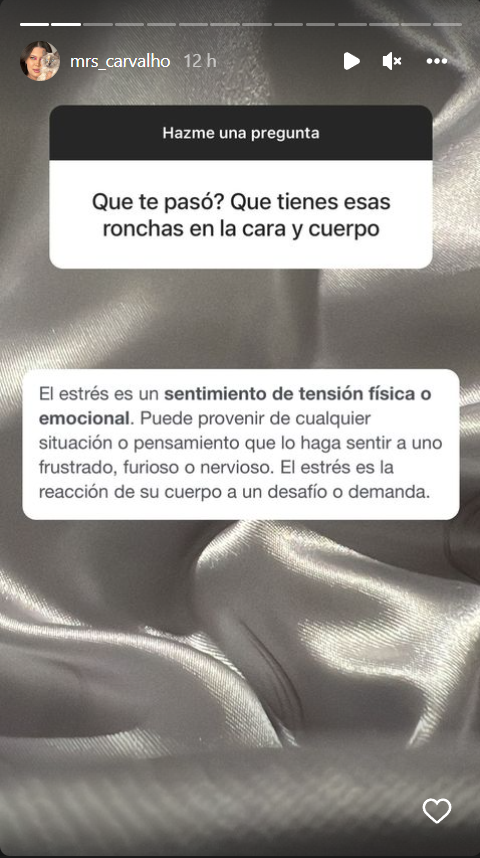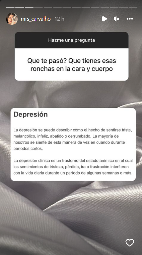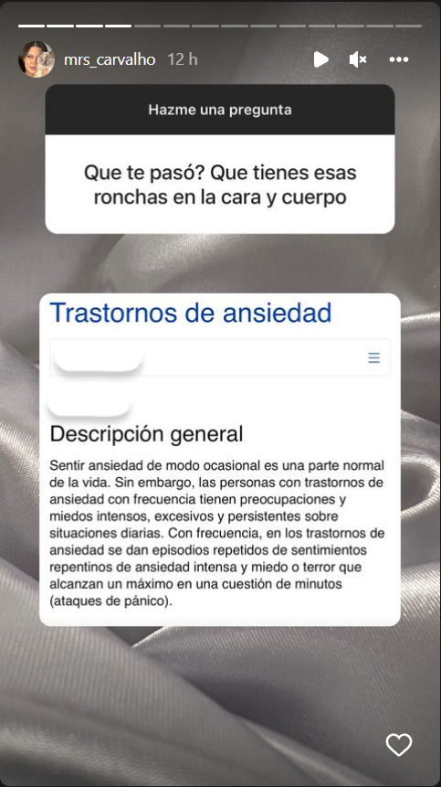 Tras esa storie, a Carvalho le consultó a qué se debían estas marcas en su cuerpo. Fue ahí cuando comenzó a compartir definiciones sobre salud mental, específicamente aquellas correspondientes al estrés, a los trastornos de ansiedad, y la depresión; dando a entender que esa sería la causas de las laceraciones en su piel.