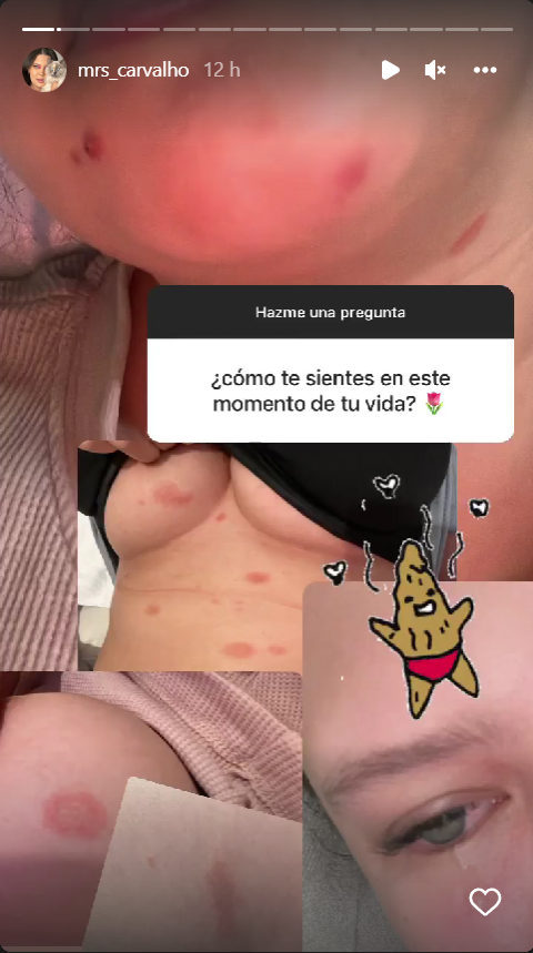 La modelo brasileña compartió en Instagram registros de su cuerpo lleno de ronchas. Tras ser consultada sobre las causas de estas lesiones, Carvalho se limitó a responder con capturas sobre salud mental.