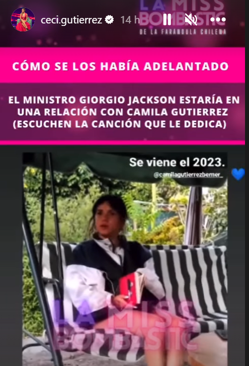 Por su parte, este lunes, Camila también publicó un registro en el que aparece compartiendo en una mesa junto al actual ministro y de fondo de escucha una canción de La Mosca Tsé-Tsé, llamando la atención de los cibernautas por el posible romance.