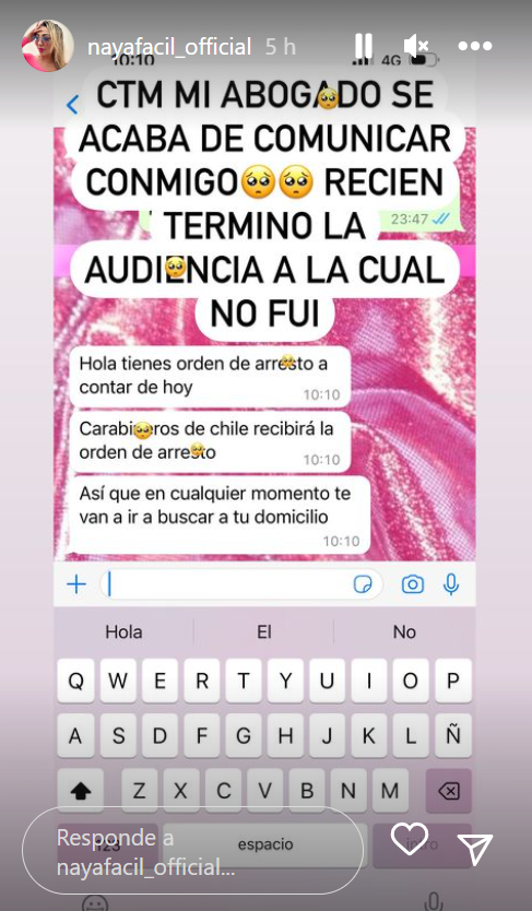 La influencer compartió en su cuenta de Instagram, el pantallazo de la conversación de Whatsapp que tuvo con su abogado, donde le confirmaba que a partir de hoy Carabineos podía ir a buscarla a su casa.