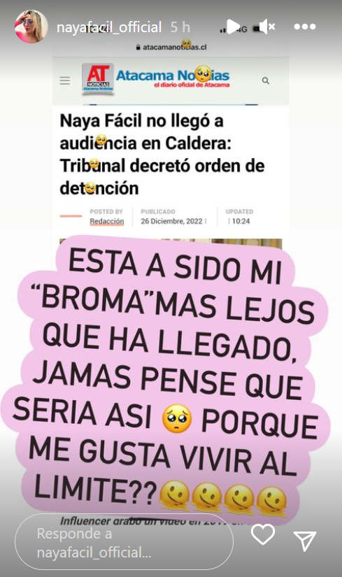 Un complejo momento se encuentra viviendo Naya Fácil, luego de compartir en redes sociales que se emitió una orden de arresto en su contra tras no asistir a la audiencia de formalización por un delito cometido en Caldera.