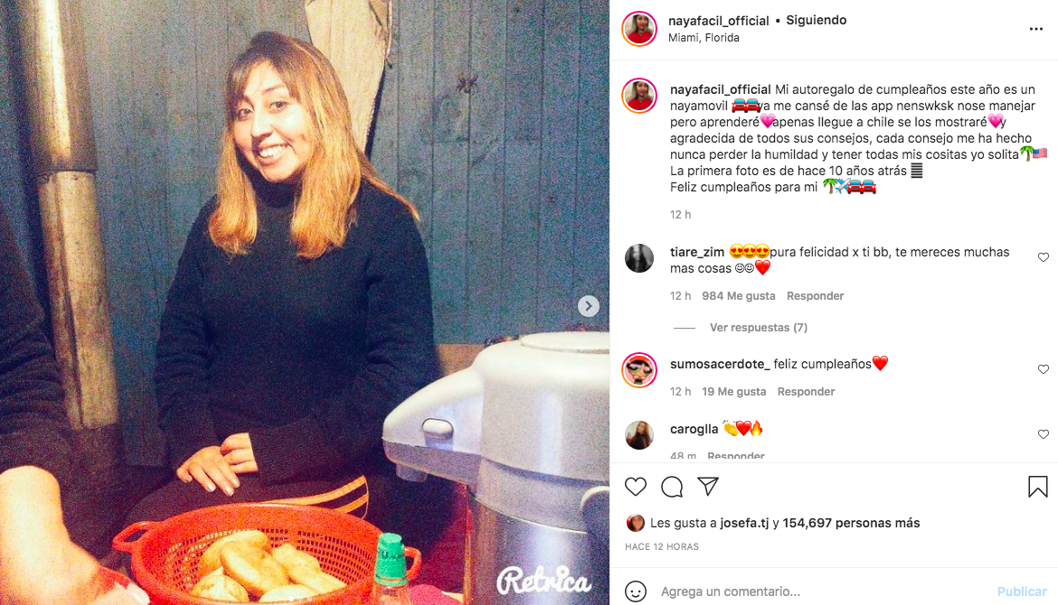 "Mi autoregalo de cumpleaños este año es un nayamovil, ya me cansé de las app nenswksk no sé manejar pero aprenderé. Agradecida de todos sus consejos, cada consejo me ha hecho nunca perder la humildad y tener todas mis cositas yo solita", expresó la chilena.