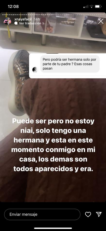 Esto generó una gran cantidad de comentarios por parte de sus seguidores. Uno incluso, le preguntó si podría ser hermana solo por parte de su padre, a lo que Naya contestó “Puede ser pero no estoy niai, solo tengo una hermana y esta en este momento conmigo en mi casa, los demás son todos aparecidos y era”.