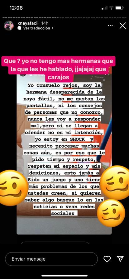 “Yo Consuelo Tejos, soy la hermana desaparecida de la naya fácil, no me gustan las pantallas, ni los consejos de personas que no conozco, nunca les voy a responder mal, pero si se llegan a ofender no es mi intención, yo estoy en SHOCK y necesito procesar muchas cosas aún”, decía la primera parte de la historia publicada por Naya.