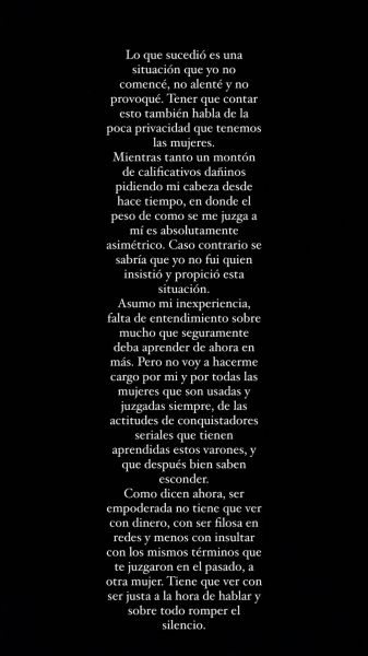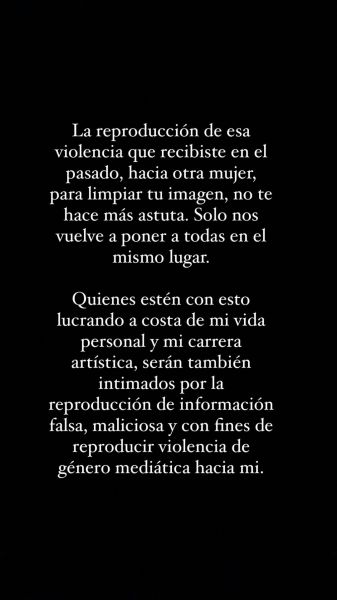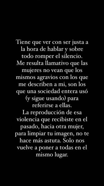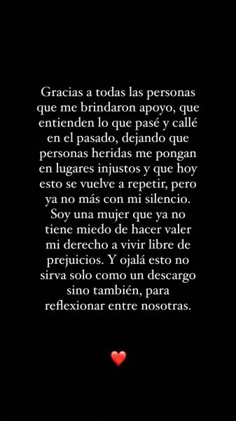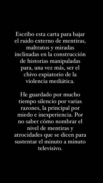 “Escribo esta carta para bajar el ruido externo de mentiras, maltratos y miradas inclinadas en la construcción de historias manipuladas para, una vez más, ser el chivo expiatorio de la violencia mediática”, comenzó relatando en sus historias de Instagram.