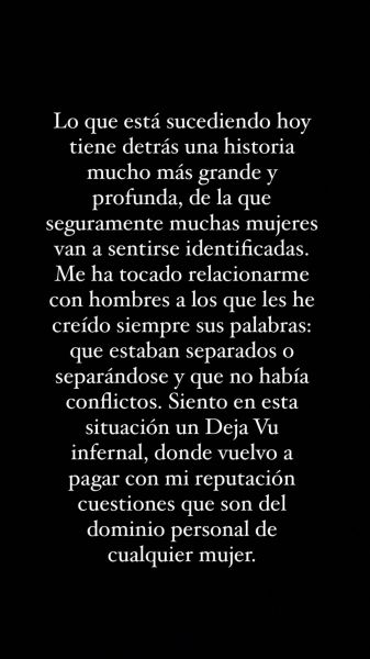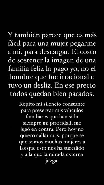 La argentina se refirió a su reputación y declaró: “deja a la luz mi inexperiencia y sobre todo profunda credibilidad que le di a estos hombres, que luego guardaron silencio dejando que me comieran los lobos. Parece que es más creíble para esta sociedad, sabiendo cómo se manejan ellos siempre, que yo sea la mala, la que engaña y no la engañada. Y también parece que es más fácil para una mujer pegarme a mí, para descargar”.