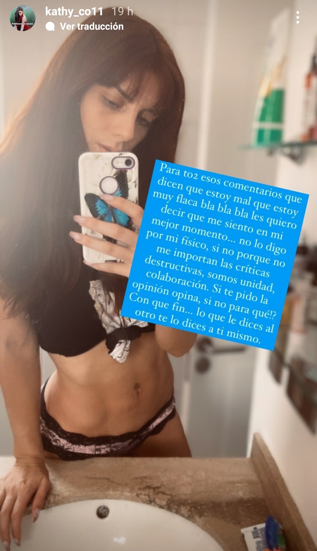 "Para todos esos comentarios que dicen que estoy mal, que estoy muy flaca, bla bla bla, les quiero decir que me siento en mi mejor momento", partió aclarando la ex chica reality, para luego cerrar su respuesta con un tajante "lo que le dices al otro, te lo dices a ti mismo".