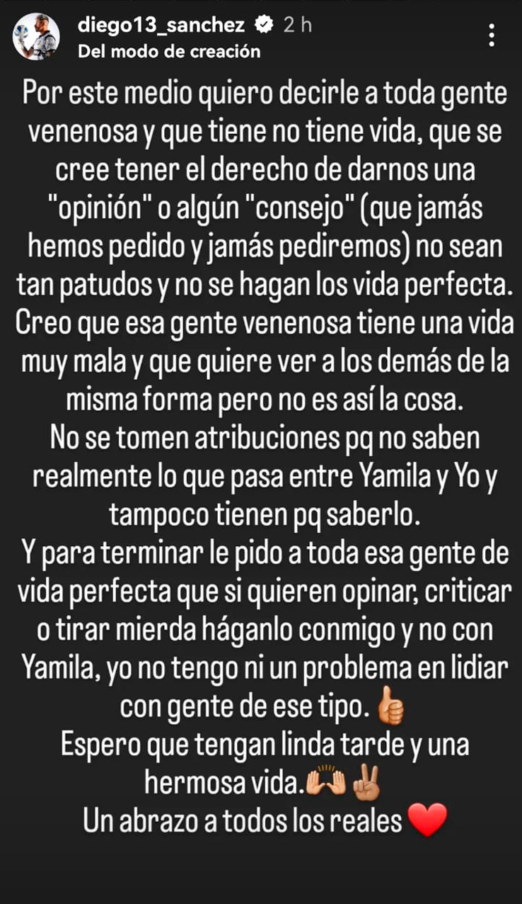 Siguiendo la misma línea, el futbolista agregó: “Creo que esa gente venenosa tiene una vida muy mala y que quiere ver a los demás de la misma forma pero no es así la cosa. No se tomen atribuciones porque no saben realmente lo que pasa entre Yamila y yo y tampoco tienen porque saberlo”.