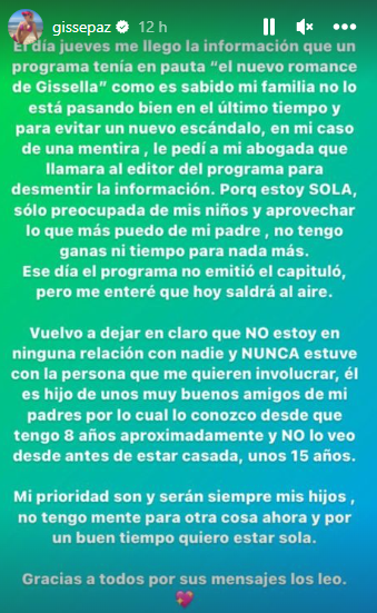 “Estoy sola, solo preocupada de mis niños y aprovechar lo que más puedo a mi padre. No tengo ganas ni tiempo para nada más. Ese día el programa no emitió el capítulo, pero me enteré que hoy saldrá al aire. Vuelvo a dejar en claro que no estoy en ninguna relación con nadie y nunca estuve con la persona que me quieren involucrar”, aclaró Gissella.