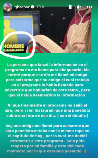 “Vi que finalmente el capítulo no salió al aire, pero vi en Instagram que una panelista subió una foto de ese día con el detalle. Hoy una amiga me llamó para avisarme que este panelista estaba con la misma ropa en el capítulo de hoy, por lo cual me decidí a desmentir este programa. Solo pido respeto por mi familia y este delicado momento que estamos pasando”.