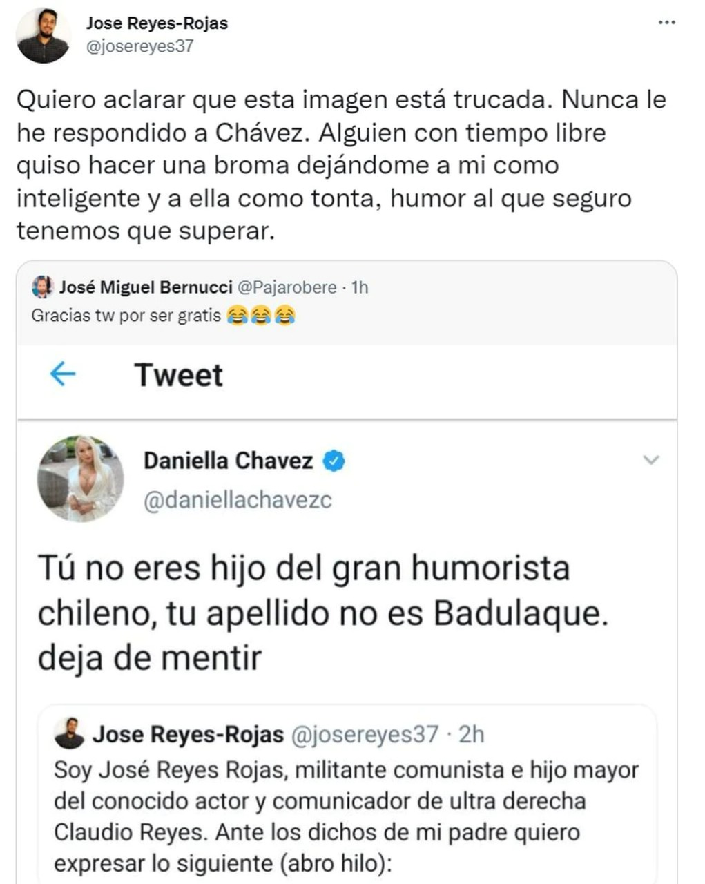 Posteriormente, se viralizó una supuesta respuesta que habría hecho la modelo, Daniella Chavéz, al tweet del hijo del comediante. "Tú no eres hijo del gran humorista chileno, tu apellido no es Badulaque, deja de mentir", era parte de lo que se estipulaba en supuesto mensaje.