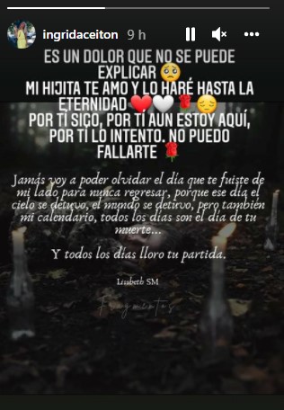 “Jamás voy a poder olvidar el día que te fuiste de mi lado para nunca regresar, porque ese día el cielo se detuvo, el mundo se detuvo, pero también mi calendario, todos los días son el día de tu muerte… Y todos los días lloro tu partida”, relató la influencer.