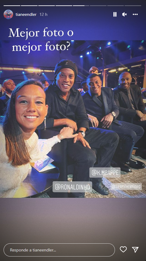 En medio de la ceremonia, la portera que juega en el Olympique aprovechó la instancia para tomarse una fotografía con figuras del fútbol mundial masculino. A través de sus redes sociales compartió una postal donde se le ve junto a el brasileño Ronaldinho y los franceses Kylian Mbappé y Thierry Henry, todos campeones del mundo y que participaron de la ceremonia realizada en París.