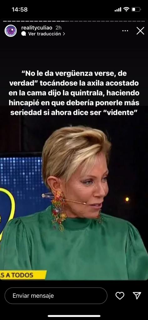 La también actriz señaló: "No le da vergüenza verse de verdad, tocándose la axila acostado, debería ponerle más seriedad si ahora dice ser vidente".