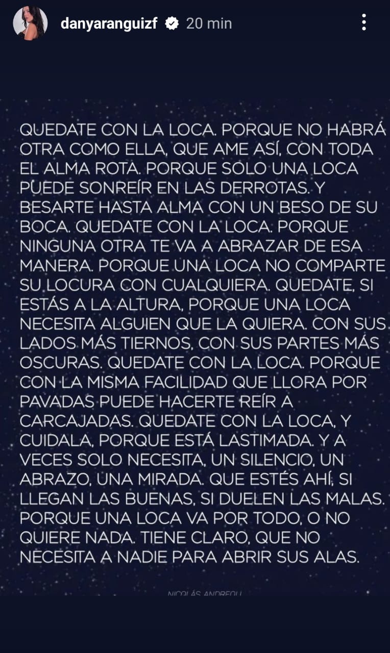 “Quédate con la loca, porque no habrá otra como ella que ame así con toda el alma rota, porque solo una loca puede sonreír en las derrotas y besarte hasta el alma con un beso de su boca”, comenzó el relato a través de su cuenta de Instagram.