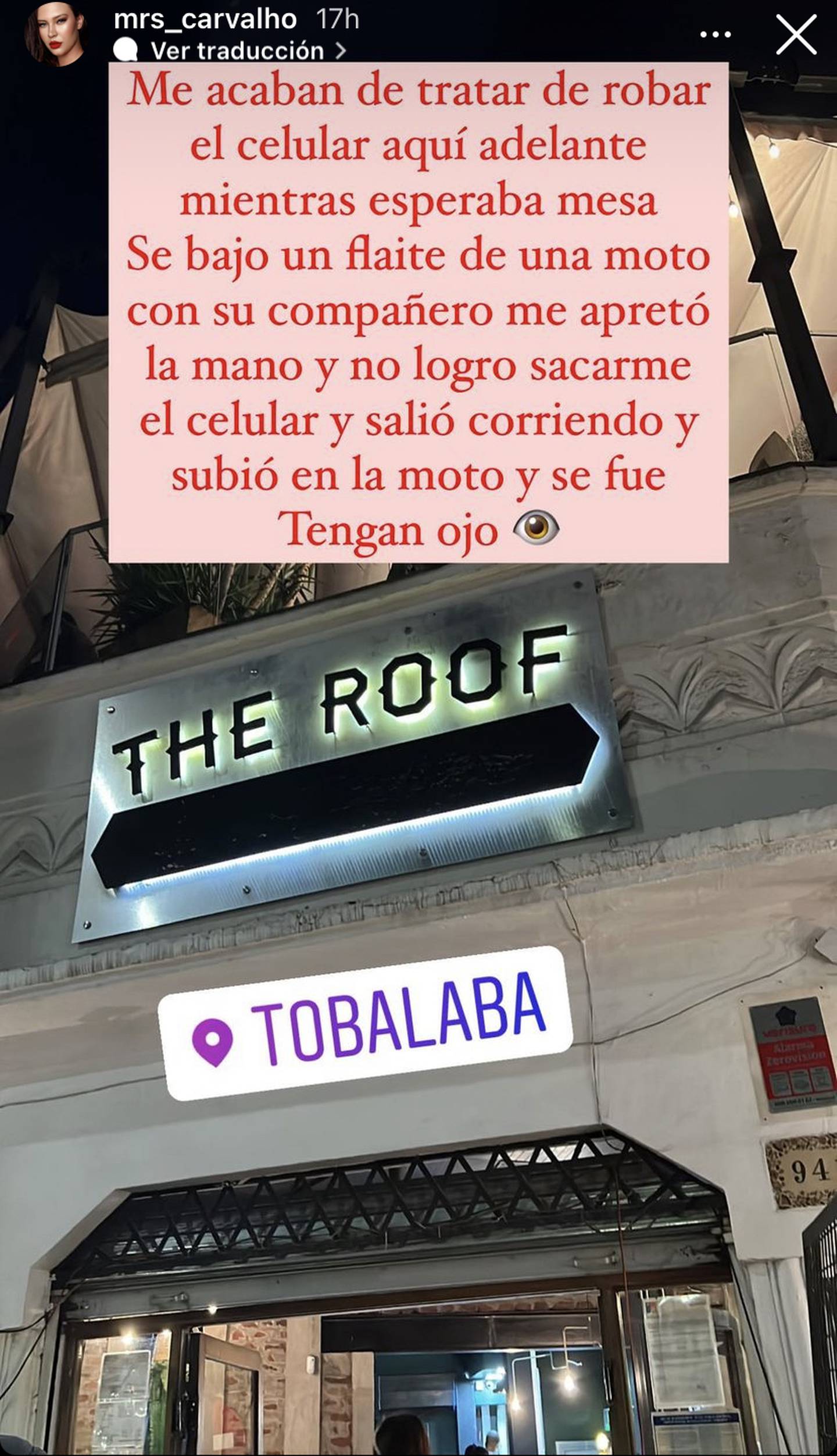 "Me acaban de tratar de robar el celular aquí adelante mientras esperaba mesa. Se bajó un flaite de una moto con su compañero, me apretó la mano y no logró sacarme el celular", fue parte de lo que contó Carvalho, dando a entender que, al menos, ella se encuentra bien y los asaltantes no lograron su cometido.