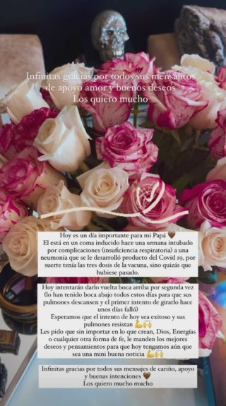 Posteriormente, detalló: “Intentarán darlo vuelta boca arriba por segunda vez (lo han tenido boca abajo todos estos días, para que sus pulmones descansen y el primer intento de girarlo falló. Esperemos que este intento sea exitoso y sus pulmones resistan”, expresó Kel. Quien agradeció a sus seguidores por las buenas vibras y oraciones para que su padre se recupere pronto.