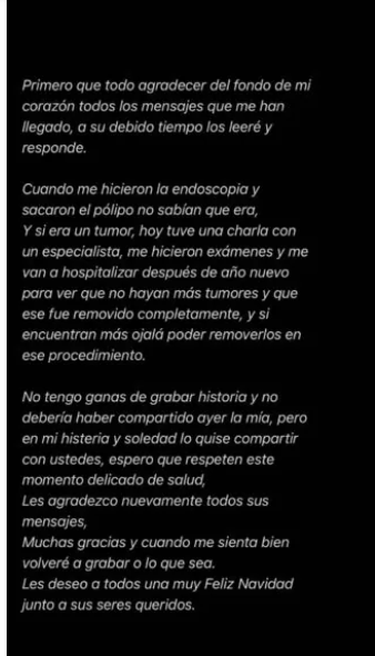 También, reveló que habló con un especialista en el tema quien le detalló más información sobre su caso: “me hicieron exámenes y me van a hospitalizar después de Año Nuevo para ver que no hayan más tumores y que ese fue removido completamente, y si encuentran más, ojalá poder removerlos en ese procedimiento”.