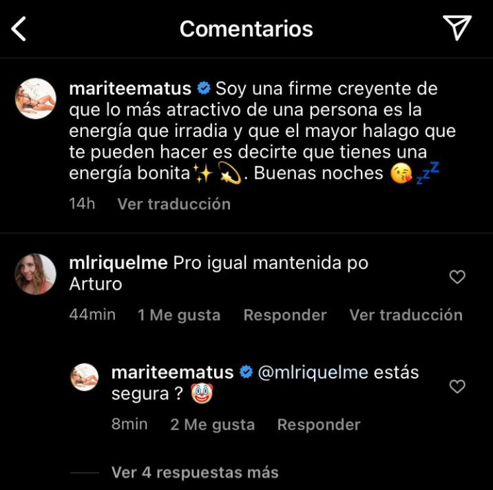 Tras esto, una usuaria le dejó un ofensivo comentario. "Pero igual eres mantenida por Arturo (Vidal)", le escribió una seguidora. Ante esto, la ex esposa del "King", le respondió sin filtro. "¿Estás segura?", afirmó Marité acompañado de un emoji de payaso.