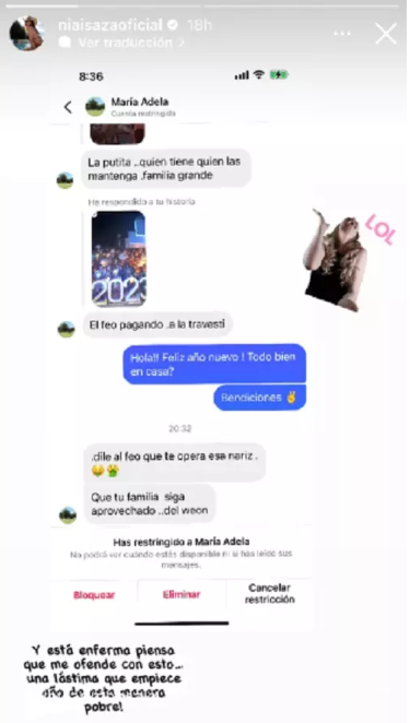 “Y esta enferma piensa que me ofende con eso… una lástima que empiece el año de esta manera tan pobre”, escribió la pareja del King junto a la captura.