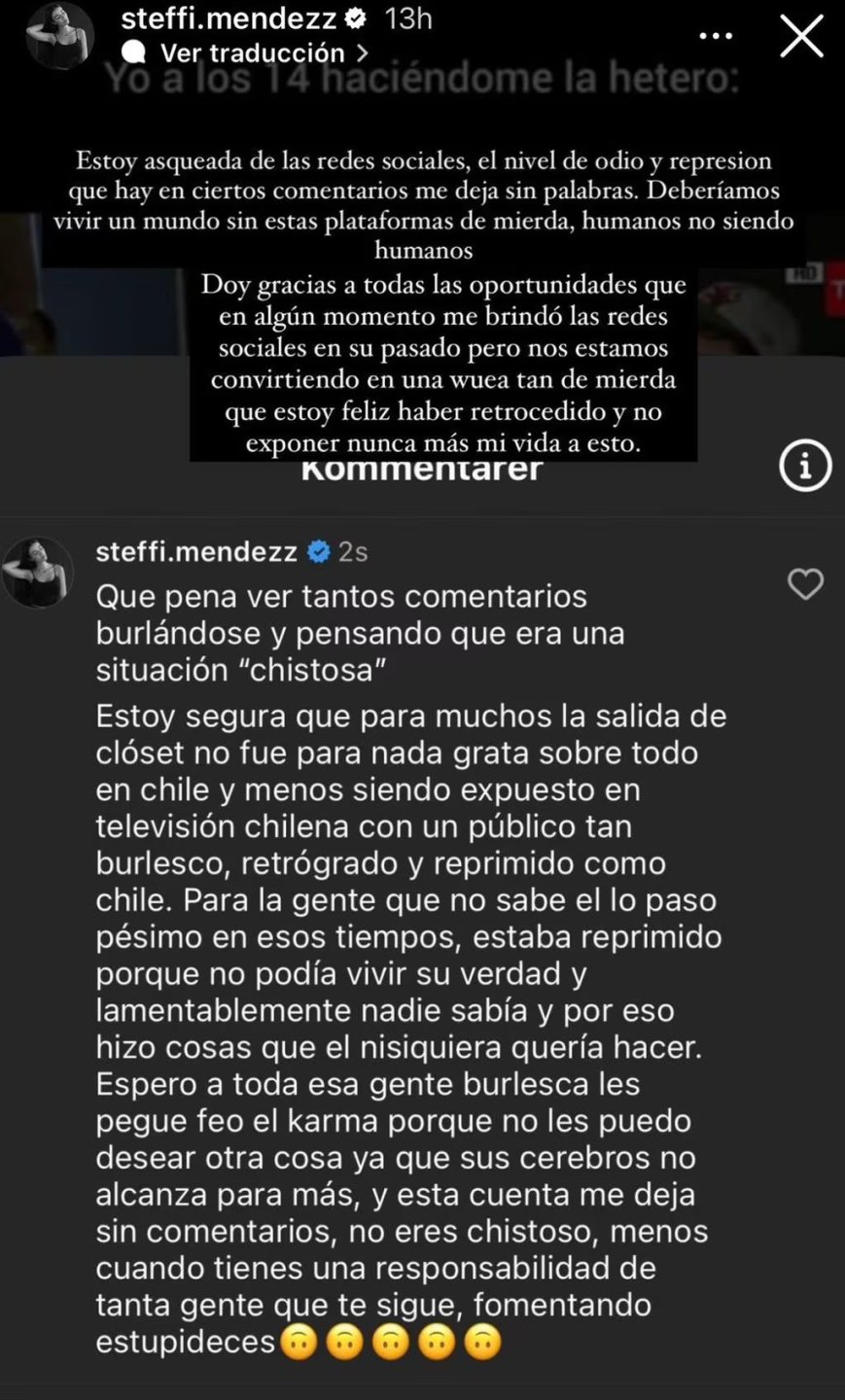 “Qué pena ver tantos comentarios burlándose y pensando que era una situación ‘chistosa’. Estoy segura de que para muchos la salida del clóset no fue para nada grata, sobre todo en Chile, y menos siendo expuesto en televisión con un público tan burlesco, retrógrado y reprimido como en Chile”, mencionó Steffi.
