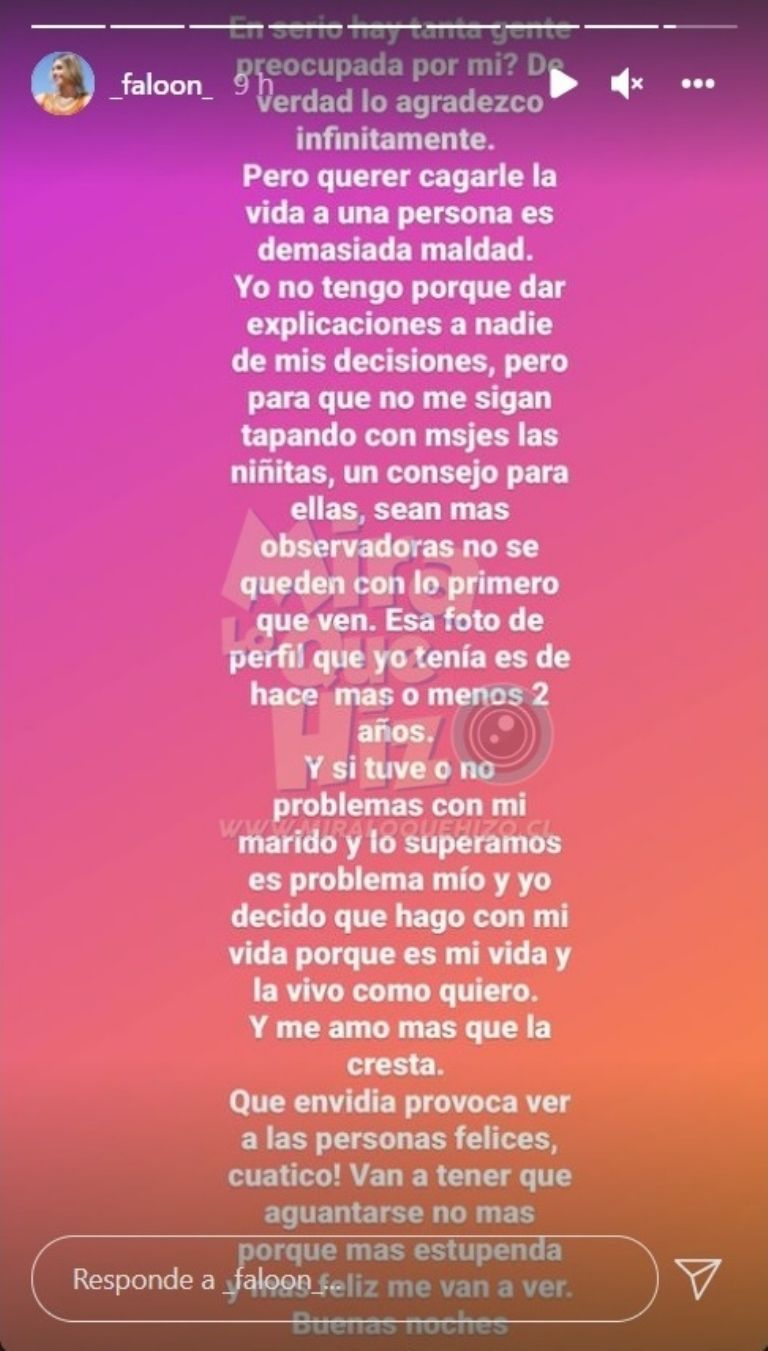 Finalizó su respuesta con: “Para que no me sigan tapando con mensajes las niñitas, un consejo para ellas, sean más observadoras, no se queden con lo primero que ven. Esa foto que yo tenía es de hace más o menos dos años. Si tuve o no problemas con mi marido y lo superamos, es problema mío y yo decido qué hago con mi vida porque es mi vida y la vivo como quiero. Y me amo más que la cresta. Qué envidia provoca ver a las personas felices, cuático".