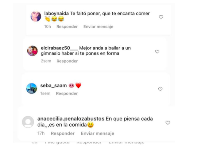 Sin embargo, a los pocos días de mostrar los fuertes comentarios que recibe en las plataformas digitales, volvió a recibir nuevos ataques como: “Te faltó poner que te encanta comer”, “Mejor anda a bailar a un gimnasio haber si te pones en forma”, “En que piensa en cada día es en la comida”, “Majin boo” (persona de Dragon Ball) y “En rodar”.
